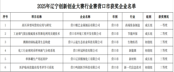 此次賽事中,營口參賽企業(yè)聚焦細分領(lǐng)域深耕細作,多個項目憑借技術(shù)創(chuàng)新性、市場應(yīng)用價值及產(chǎn)業(yè)化前景獲得評委認可。其中,營口精藝金屬制品有限公司的“高壓異型風(fēng)管的應(yīng)用與研究”項目,特殊材質(zhì)滿足超低溫要求,適配高端裝備制造等特殊場景需求,填補國家空白;營口市環(huán)境工程開發(fā)有限公司的“工業(yè)煙氣鎂法脫硫廢水資源化利用關(guān)鍵技術(shù)”,為環(huán)保領(lǐng)域破解廢水處理難題、實現(xiàn)資源循環(huán)提供新路徑;營口云起生態(tài)農(nóng)業(yè)科技有限公司“溯源的綠標蔬菜生態(tài)構(gòu)建”項目,搭建農(nóng)產(chǎn)品全鏈條質(zhì)量追溯體系,助力農(nóng)業(yè)高質(zhì)量發(fā)展;營口鳴創(chuàng)醫(yī)學(xué)科技有限公司的“醫(yī)護臨床技能在線考評學(xué)習(xí)系統(tǒng)”項目,為醫(yī)療領(lǐng)域人才培養(yǎng)與技能考評提供數(shù)字化解決方案;營口科冠科技有限公司“化工行業(yè)密閉采樣和液氣分離系統(tǒng)”、營口遼濱精細化工有限公司“單體硼生產(chǎn)用還原爐”項目,則分別在化工安全升級、高端材料制造設(shè)備優(yōu)化上展現(xiàn)技術(shù)優(yōu)勢。